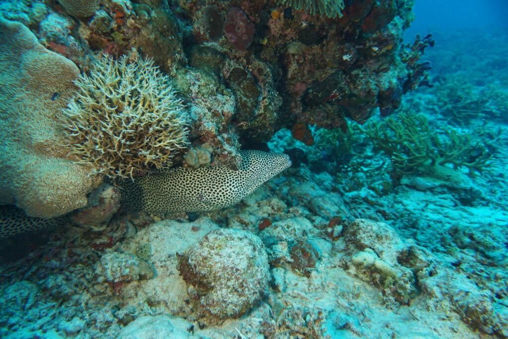 ガラ場を移動し、根を回る。大きな水玉模様のニセゴイシウツボが印象的。