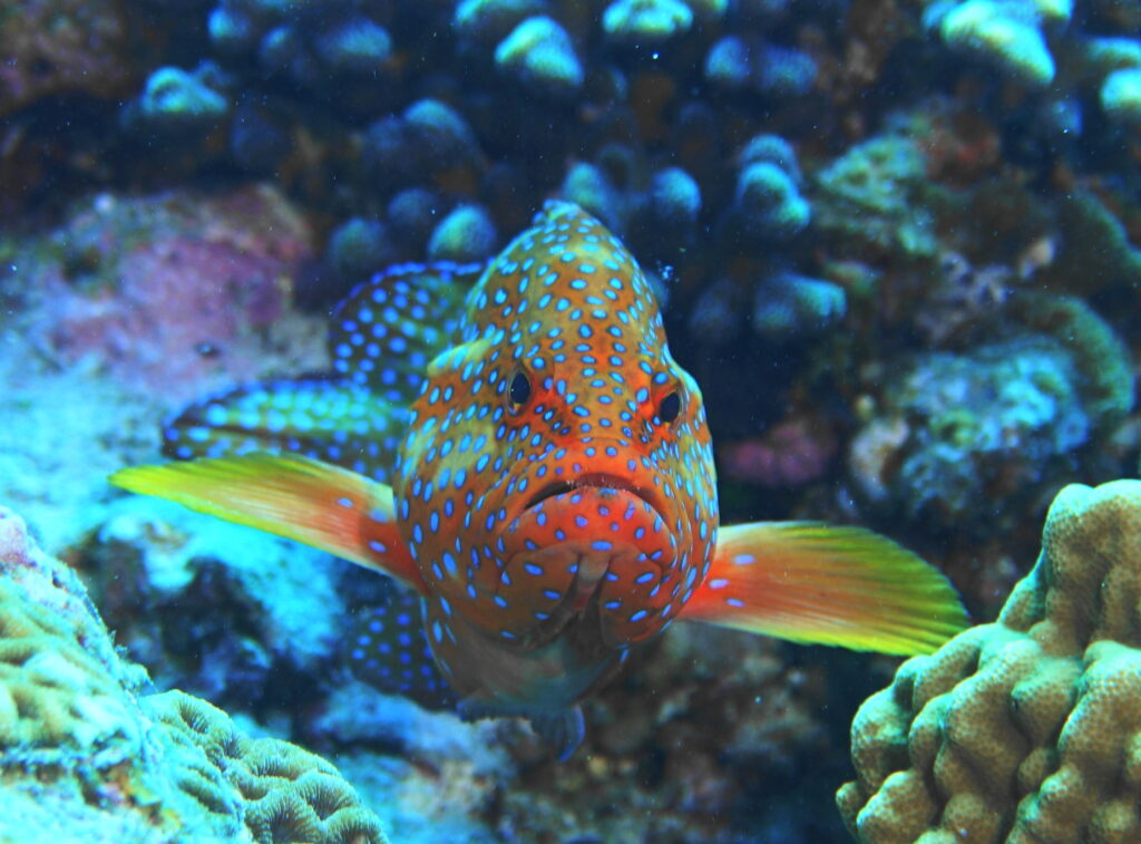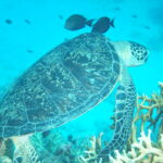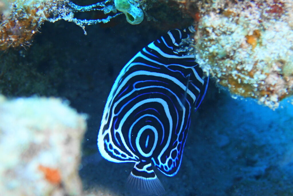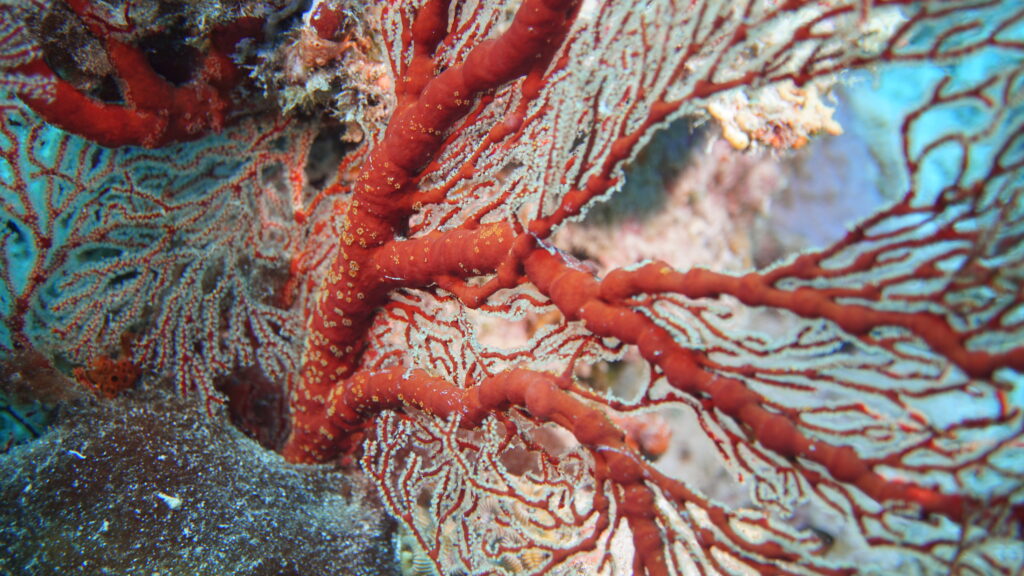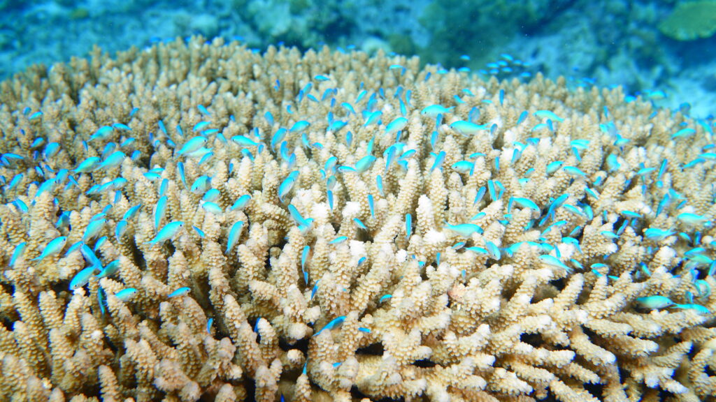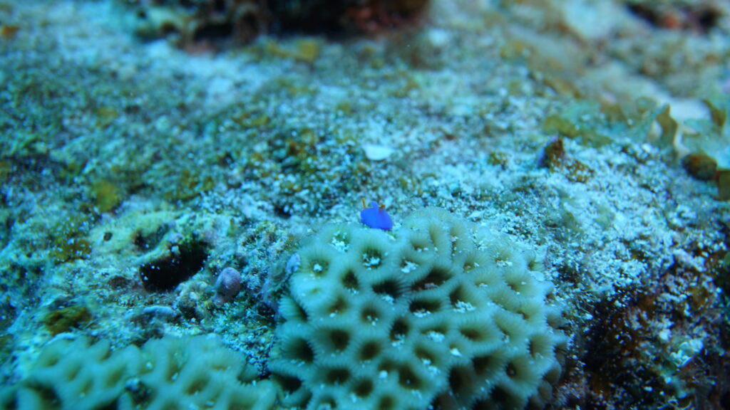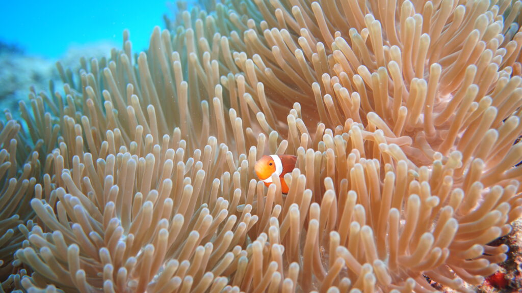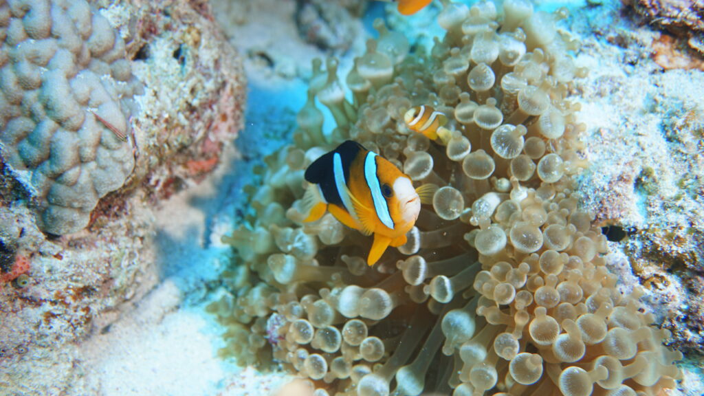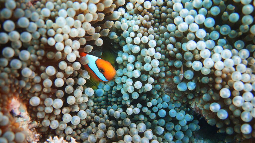 浅いポイントだが魚影が濃い。まずエントリーしてすぐの根にカクレクマノミ。