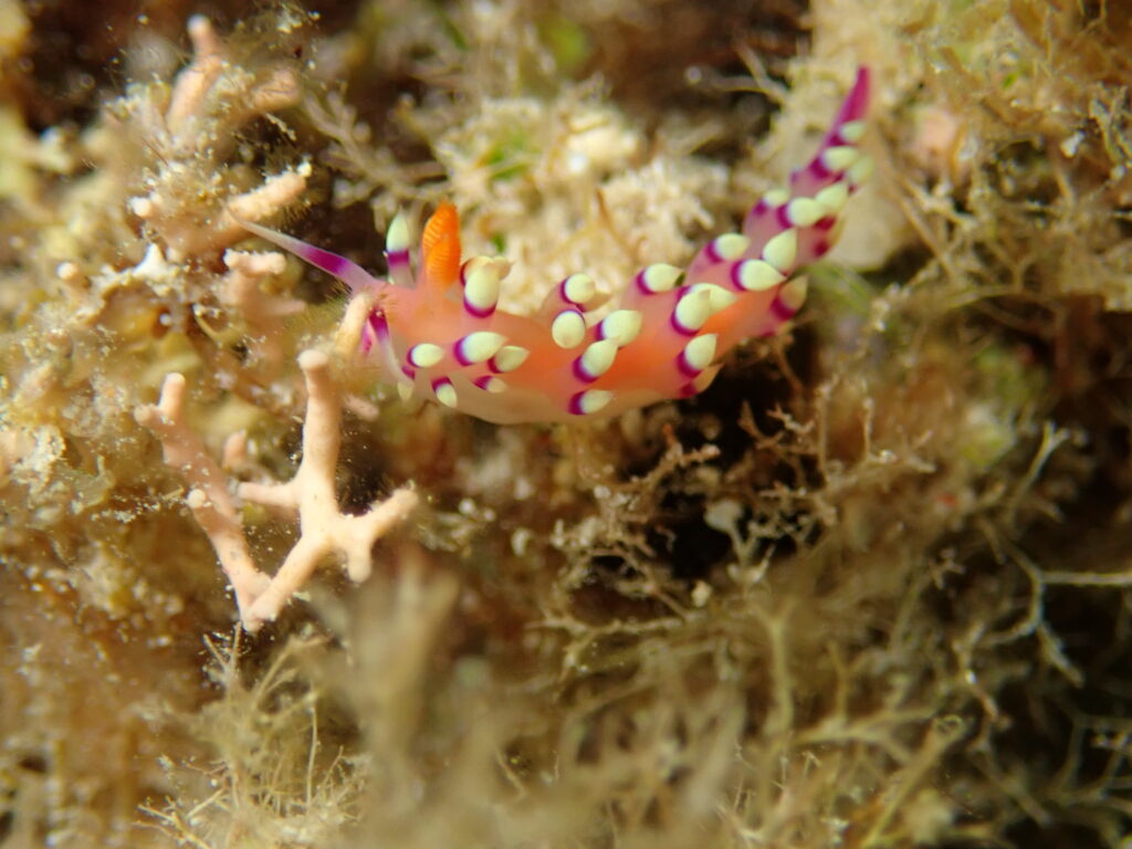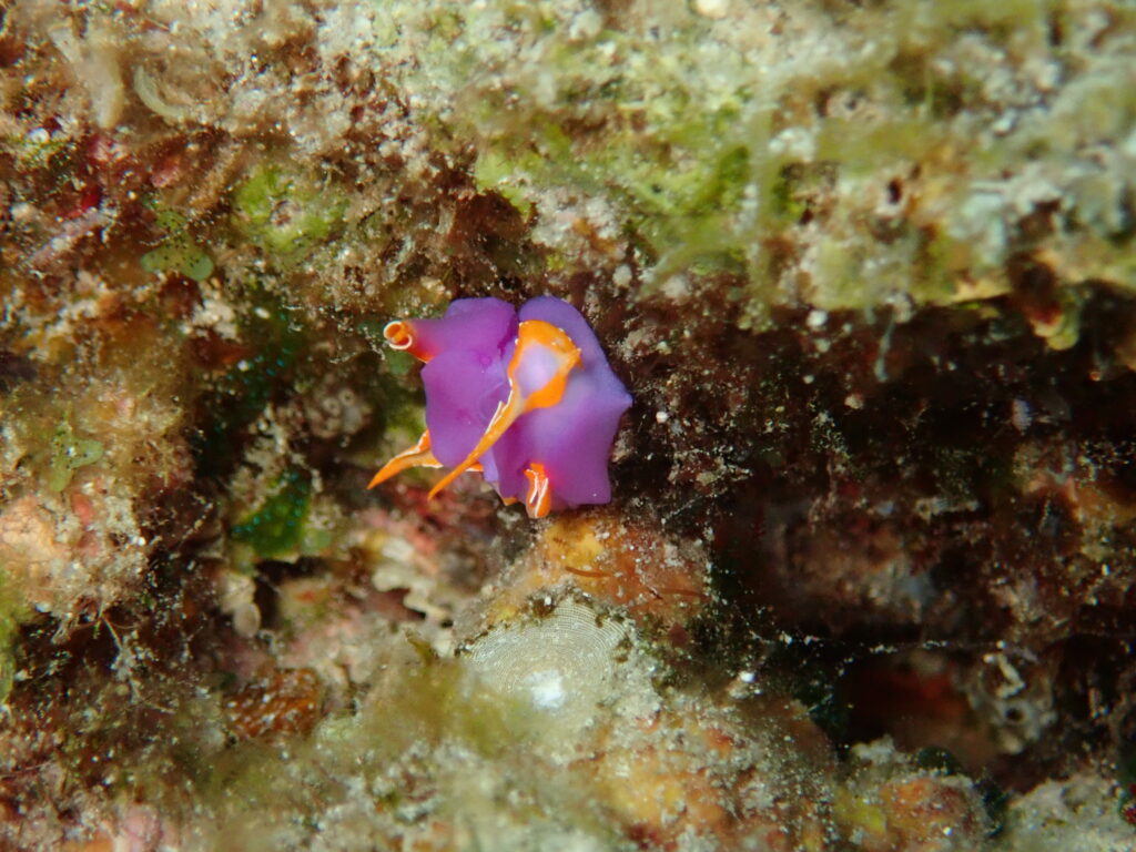 今回の座間味ツアーでは、天気が悪かったこともあるんだけど「ウミウシ」探ししてました。ムラサキウミコチョウ(これは二匹)とアデヤカミノウミウシ。ウミウシは簡単に言うと貝の中身。ナメクジの海版みたいな感じ。捕食されないように、毒々しくしてるんだとか。座間味で多くの種類を見ることができます。ただし難点は、小さすぎるんで老眼にはつらすぎる。写真に撮った後で確認なんですわ
