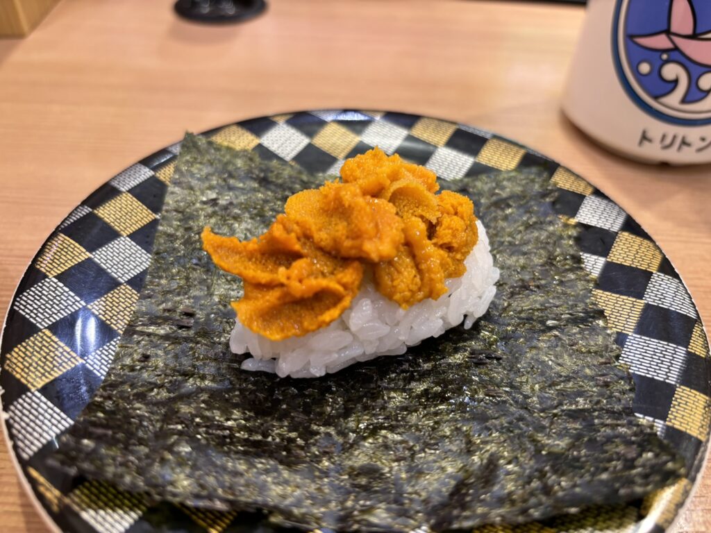 おや?これは、かの有名な「回転ずしトリトン」腹ごなしのはずが、なんの迷いもなく入店。11時からだったのですでに行列で20番目。しかし、おひとり様だったので15分ほどでカウンター席に案内していただけました。