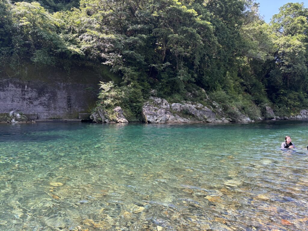 さて、銚子川は宿から15分ぐらい。「種まき権兵衛の里」の前の河原で少し足を浸けてみる。
