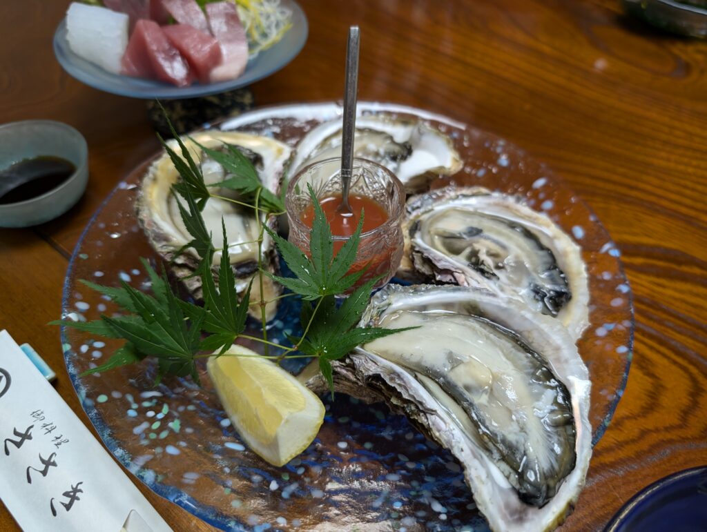 民宿の夕食は。岩牡蠣尽くし!岩牡蠣って1個700円くらいするのが10個&お造りやてんぷら。